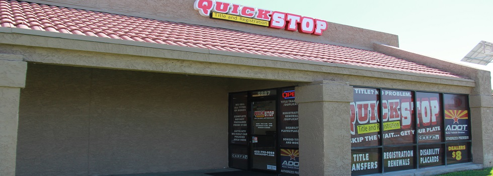 Quick Stop Title and Registration is a Government Convenience company that is contracted with multiple State and Federal agencies to provide you the same services without the wait and unfriendly customer service. We are here to service our customers with the highest level of professionalism while getting you in-and-out in minutes. You can get all of the same services that you could get at the ADOT/MVD offices. There is a small convenience fee that varies depending on what type of transaction is being processed (ranges $3 to $35) in addition to the fee's declared by the State or Federal agency. If your time is money, save time and come in today to get your Travel ID, Drivers License, license plates, titles, registrations, placards, and many more services over the counter, and QUICK.